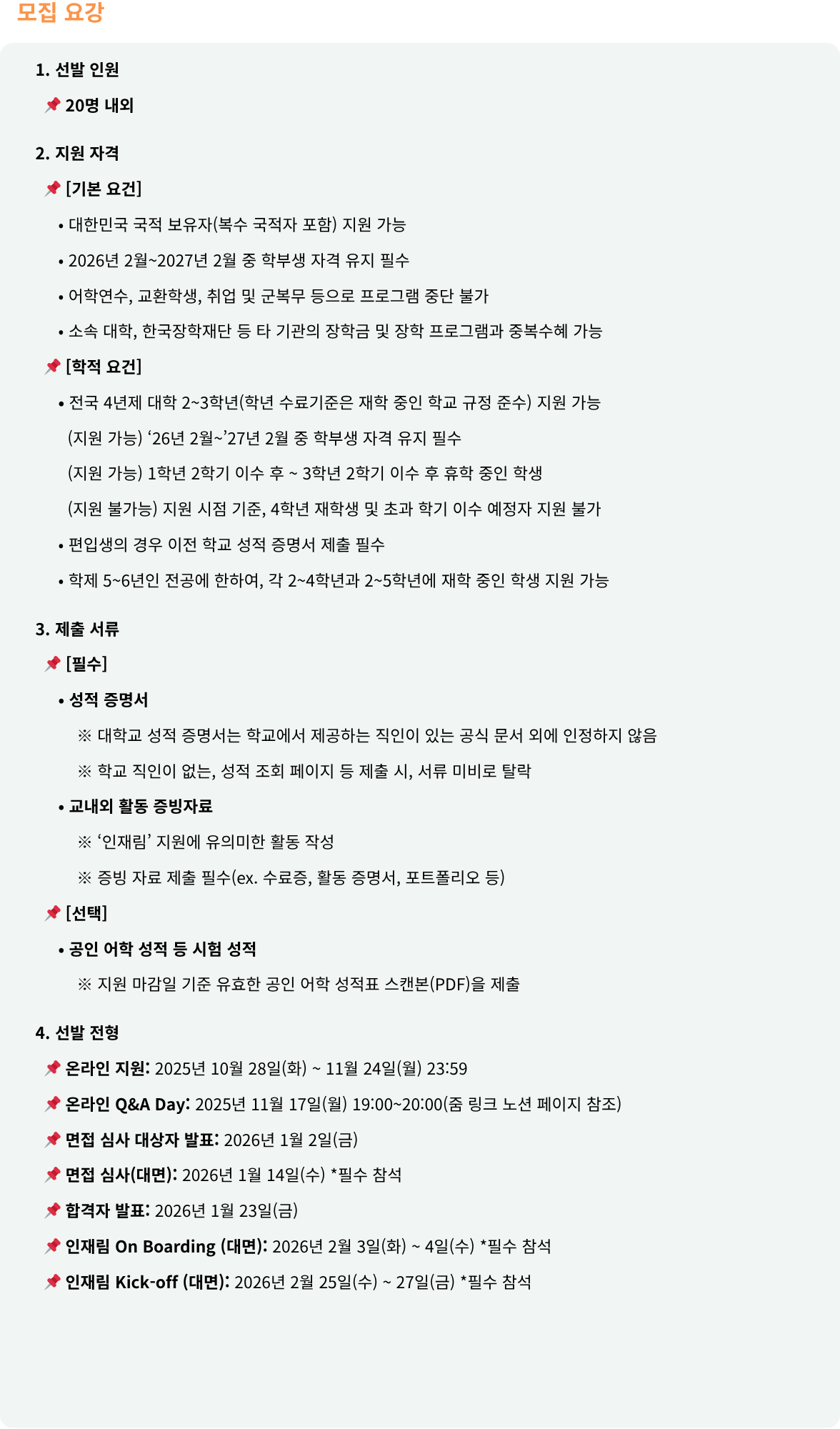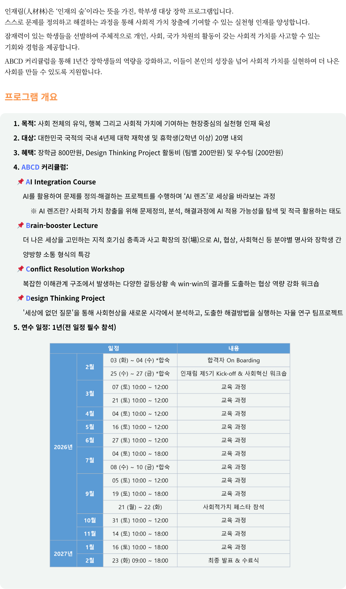 ※ 서울 및 경기권 제외 지방 소재 대학에 재학 중인 학생들에게는 인재림 연수과정 참석을 위한 왕복 교통비(KTX 일반석 기준)가 지원됩니다.